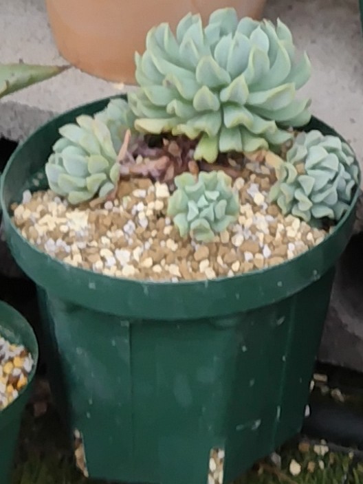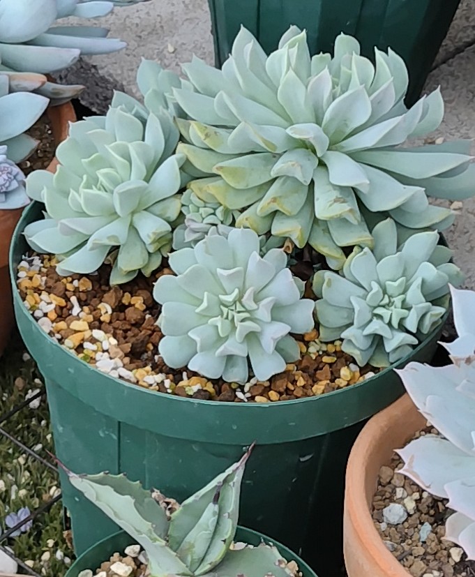 5か月後。5号スリット鉢に植え替え、子株が大きくなってきたので間引いた。鉢に1株大きなのが生えている姿もいいが、群生も豪華でいい。管理の問題かもしれないが、他のエケベリアと比較し、トップシータービーは群生しやすいように思う。
